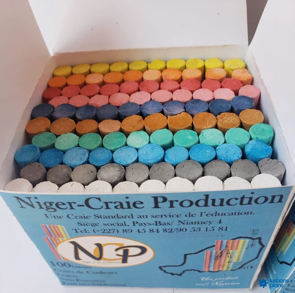 Craie de couleur, jusqu'à 10 couleurs variées. 100 bâtons dans la boîte. Le carton contient 30 boîtes.